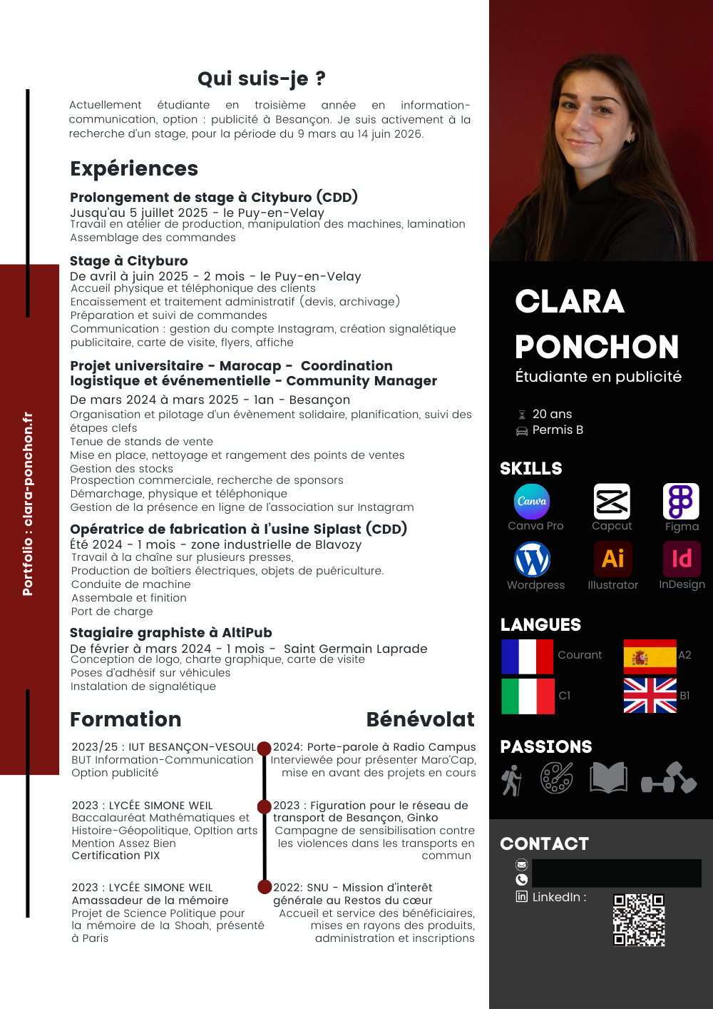J’ai 20 ans et suis actuellement en troisième année de BUT en Info-Com à Besançon. Ce que je préfère dans cette formation c’est la possibilité de créer, sur tout support, photo, vidéo, affichage. Un objectif après mes études ? J’aimerais poursuivre dans la communication, en particulier dans un métier de graphisme. Pour en savoir plus sur mon parcours et mes expériences, téléchargez mon CV ou consultez mon profil LinkedIn.